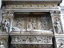The wall tomb of the Cypriot Cardinal Ludovico Podocataro, secretary and physician of Pope Alexander VI, is a monumental work of Roman Renaissance sculpture. The prominent humanist and papal diplomat was buried on 7 October 1504 with great pomp; the location of the tomb in the right transept was originally close to the funerary chapel of the Borgia family, Podocataro's patrons, but the chapel is no longer extant.