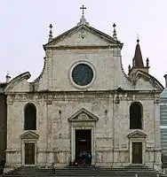 The façade was built in early Renaissance style in the 1470s when the medieval church was rebuilt by Pope Sixtus IV. It was later reworked by Gian Lorenzo Bernini in the 17th century but pictorial sources preserved its original form, for example a woodcut in Girolamo Franzini's guide in 1588,[27] and a veduta by Giovanni Maggi in 1625.[28] Originally there were tracery panels in the windows and spokes in the central rose window, and the building was free-standing with a clear view of the bell tower and the row of identical side chapels on the right.