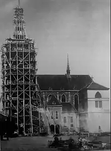 A wooden balcony, topped by a pyramidal roof and a four-meter-high metal cross, is situated on sixth story. The decoration of the south wall includes a stone relief with a city's coat-of-arms. The western facade of the church is reinforced by support pillars and includes Gothic arches and a big rosette window with stone tracery.[2]