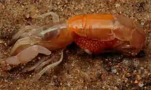 Trypaea australiensis, known as the (marine) yabby or ghost nipper in Australia, or as the one-arm bandit due to their occasional abnormally large arm,[1] and as the Australian ghost shrimp elsewhere,[2] is a common species of mud shrimp in south-eastern Australia,[2] and may be the only extant species in the genus Trypaea.[3][4] T. australiensis is a popular bait used live or frozen by Australians targeting a range of species.[5] It grows to a length of 6 centimetres (2.4 in) and lives in burrows in mudflats or sandbanks, especially in or near estuaries.[6]