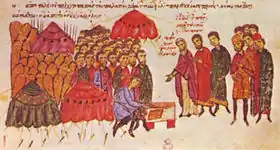 By 917, after a series of successful campaigns, the Byzantine Empire had stabilized its eastern borders, and the generals John Bogas and Leo Phocas were able to gather additional troops from Asia Minor[20] to reinforce the imperial tagmata and the European thematic troops, gathering a force of some 60,000 men.[6] This was a very large army by contemporary standards, and its goal was the elimination of the Bulgarian threat from the north. The Byzantine commanders were convinced that their strategy would be successful. Morale was raised as the soldiers vowed by the miraculous Cross to die for one another. The spirit of the army was further raised as the troops were paid in advance and a fleet commanded by Romanus Lecapenus set off to the north at the mouth of the Danube. The Byzantines had tried to pay some Pecheneg tribes to attack, but Romanus would not agree to transport them across the Danube, and instead, they attacked Bulgarian territory on their own.[21]