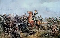 The British delivered their first volley at long range and failed to fell a single Russian.[59] A second volley thundered, supported by fire from guns of Barker's battery and those of the Marines. This caused the Russians to swerve to their left, which Campbell took as an attempt to turn his right. He sternly checked an inclination to charge with the bayonet, and instead threw forward the 93rd's right-hand, grenadier company, under Captain Ross.[60] This delivered a third volley which decided the issue. Barely five minutes after it had begun the Ingermanland Hussars were in retreat, and heading towards the Causeway Heights: the Russian commander of the brigade had reasoned that such a small, unsquared line of British infantry could not hope to hold out a cavalry charge, therefore there must be a larger force behind them.[61] It was not until later accounts that Russell's 'thin red streak' became the famous 'Thin Red Line'.[54]