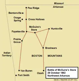 The Battle of McGuire's Store (28 October 1862) was fought at McGuire, Arkansas, near Elkins,[1] between Union forces led by Brigadier General Francis J. Herron and Confederate forces under Colonel Jesse L. Cravens during the American Civil War. The skirmish was the result of an attempt by Union Brigadier General John Schofield to trap a body of Confederate cavalry reported to be at McGuire's Store. In the event, the operation failed when Herron's column took the wrong road and approached from the west instead of the north. Herron's well-equipped troops attacked Cravens' poorly armed and demoralized Texas cavalrymen and drove them off. This minor clash and other events caused Confederate Major General Thomas C. Hindman to suspend his intended advance to recover northwestern Arkansas and withdraw to the Arkansas River. Ironically, most of Schofield's soldiers also retreated to Missouri after the fight. Though the clash was minor, it marked one pulse of the ebb and flow of the war in northwest Arkansas.