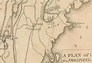 Under the cover of fog, an advance force of 4,000 men under the command of General Henry Clinton was landed on Throgs Neck.[7] To their dismay, they found they were not on a peninsula, but on an island, separated from the mainland by a creek and a marsh. There were two ways to get to the mainland: a causeway and bridge at the lower end, and a ford at the other.[7] The Americans were guarding both. Col. Edward Hand and a detachment of 25 men from the 1st Pennsylvania Regiment positioned themselves behind a length of cordwood along the causeway, after having removed the planks of wood from the bridge.[7] They surprised the British troops, who fell back and made an attempt to cross at the ford, which was guarded by another detachment.[7] The Americans guarding both positions were quickly reinforced, and the defenders soon numbered over 1,800 men.[7] Howe decided it would be better to retreat and land somewhere else.[8] He made camp on Throgs Neck and remained there for six days while supplies and reinforcements, including 7,000 Hessian soldiers under the command of Gen. Wilhelm von Knyphausen, were brought up from New York.[9] Just after midnight on October 18, Howe embarked his army again[8] and decided to land at Pell's Point near the town of Pelham, a few miles to the north.[10]