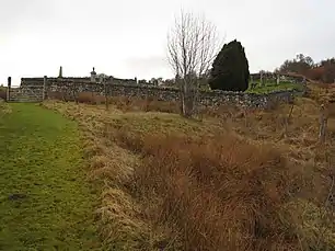 Numerous cairns once marked the battlefield, but their stones have since been used for building dry stone walls.[7] A cemetery was later built on the hillside to the east of the battlefield;[3] according to local legend the cemetery wall was built from the cairns. Today the A837 road runs through the battlefield.