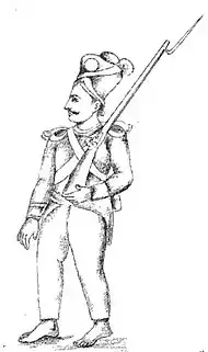 Travancore Army numbered above 50,000 trained troops of all branches, such as infantry, cavalry, artillery and irregular troops, trained and drilled according to European discipline. They were mostly armed with European weapons, procured through the English and the Dutch. This force was commanded by Europeans, Eurasians, Nairs and Pashtuns.[8]