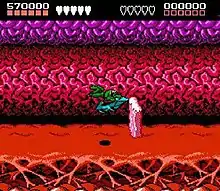 The game is a platform scrolling beat 'em up, with varying elements of racing, climbing and vehicle-based obstacle courses. Players start with three lives each time the game is started, which get replenished every time the player continues after getting defeated. The game contains no saving system or password features.[2] The player has a maximum of six hit points that can be replenished by eating flies.[3] While the levels of Battletoads vary greatly in gameplay style, the game is generally presented as a "beat'em up", in which players progress by defeating enemies while avoiding the hazards in the environment.[4]