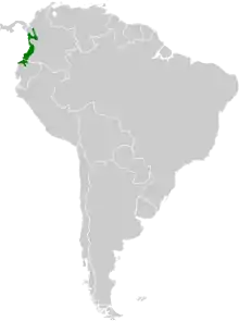 Found in Colombia and in Ecuador, on the lower slopes and at the base of the west Andean foothills.[2] There are no confirmed recent records of its presence anywhere south of Pichincha in Ecuador.[1] Its living range and population size has certainly decreased significantly recently. In 2002 the population at one site in Ecuador was estimated to be between 2500 and 7500 adult individuals, with extrapolations based on widespread transects between 1997 and 2006 leading to an extrapolated global population of 7000-21000 mature individuals.[3]