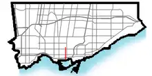 Until 1922, the section of Bay running north from Queen Street and ending at College Street was known as Terauley Street (named after the Terauley estate of John Simcoe Macaulay near Bay and Queen Streets). Several discontinuous streets existed north of College Street to Davenport Road - St. Vincent Street, Chapel Street, North Street, Ketchum Avenue. By-Law 9316 joined these streets together as far north as Scollard Street in 1922.[3] Finally, By-Law 9884, enacted on January 28, 1924, changed the name of Ketchum Avenue to Bay Street, extending it to Davenport Road.[4] There is a short street called Terauley Lane running west of Bay from Grenville Street to Grosvenor Street.