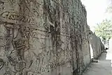 The outer wall of the outer gallery features a series of bas-reliefs depicting historical events and scenes from the everyday life of the Angkorian Khmer. Though highly detailed and informative in themselves, the bas-reliefs are not accompanied by any sort of epigraphic text, and for that reason considerable uncertainty remains as to which historical events are portrayed and how, if at all, the different reliefs are related.[11] From the east gopura clockwise, the subjects are: