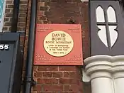 Music artist David Bowie (1947–2016) lived at 42 Southend Road from 1969 to 1973.[63] Others from the area include Rolling Stones bassist Bill Wyman, who went to school in Beckenham, Peter Frampton, who was born in Beckenham,[64] the musician David Sylvian, who was born in the town but raised in nearby Catford,[65][66] Status Quo keyboardist Andy Bown who was born in Beckenham, and musician Anne Dudley of the band Art of Noise who is from the town.