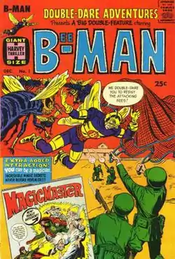 Bee-Man, by Joe Simon and writer Otto Binder and artist Bill Draut,[3] debuted as the cover feature of Double-Dare Adventures #1 (Dec. 1966).[4] His sole stories were the seven-page "The Origin of Bee-Man" in issue #1 and the 12-page "The Revolt of the Queen Bee", illustrated by Dick Ayers, in issue #2 (March 1967), on which he was also the cover feature.[4] Shortly afterward, the Harvey Thriller imprint ended.