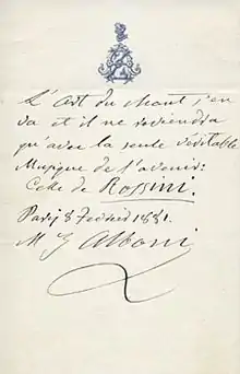 One reason for the eclipse of the old Italian singing model was the growing influence within the music world of bel canto's detractors, who considered it to be outmoded and condemned it as vocalization devoid of content. To others, however, bel canto became the vanished art of elegant, refined, sweet-toned musical utterance. Rossini lamented in a conversation that took place in Paris in 1858 that: "Alas for us, we have lost our bel canto".[11] Similarly, the so-called German style was as derided as much as it was heralded. In the introduction to a collection of songs by Italian masters published in 1887 in Berlin under the title Il bel canto, Franz Sieber wrote: "In our time, when the most offensive shrieking under the extenuating device of 'dramatic singing' has spread everywhere, when the ignorant masses appear much more interested in how loud rather than how beautiful the singing is, a collection of songs will perhaps be welcome which – as the title purports – may assist in restoring bel canto to its rightful place."[9]