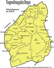 In spite of opposition from the local population, within a few years 3,635 inhabitants in 25 villages had to leave their homes.[3] Amongst the villages that disappeared from the map were Deil, Hörsten, Hoppenstedt, Hohne,[4] Hohnerode, Manhorn, Lohe, Gudehausen, Ettenbostel, Oberndorfmark, Oberhode, Benhorn, Hartem, Fahrenholz, Böstlingen, Pröbsten, Kolk, Südbostel, Nordbostel, Obereinzingen, Untereinzingen, Achterberg, Wense and parts of Oerbke, Ostenholz and Hasselhorst.[5][6]
