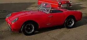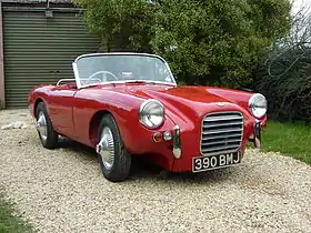 Berkeley's first production car was the 'Sports' (type SA322), announced in September 1956[6] and produced from October 1956 to January 1957. Production began with two prototypes (registered RMJ395 and RMJ946), which were seen being tested around the neighbourhood of Biggleswade in the late summer of 1956. Stirling Moss drove one at Goodwood in September, and the car was launched to the public at the 1956 London Motor Show – one year ahead of the Lotus Elite, which was also to be of fibreglass monocoque construction.