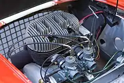 Power was provided by a British Anzani twin-cylinder 322 cc two-stroke engine producing 15 bhp (11 kW; 15 PS)[7] and mounted transversely, driving the front wheels via a chain and three-speed gearbox. The engine was already used by various motorcycle manufacturers such as Cotton and Greeves, but in the Berkeley was fitted with a Siba Dynastart to provide both battery charging and electric starting. It was an advanced two-stroke engine which incorporated a rotary inlet valve mechanism in the centre of the crankshaft.[7] The gearbox was a three-speed Albion HJR5, using a steering column-mounted gearchange.[6]