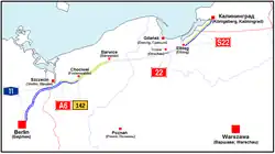 With the end of the Cold War, and particularly with Poland joining the European Union, increasing thought has been given to reconstructing the road as part of the European highway system. In the 1990s, a 14 kilometre (8.7 mile) long segment near the western Polish border was incorporated into the new A6 Autostrada (highway). A further 7 kilometres (4.3 miles), to the junction with National Road 10, was being restored and was scheduled to open for traffic in August 2007. An additional 8 kilometres (5.0 miles) is to be upgraded at some future date and redesignated as part of the A6. The section between Elbląg and the border with Russia was completely reconstructed and opened as an express road, S22, in September 2008. In the course of the upgrade, the new modern carriageway was built in the space left for the second carriageway during original construction. At the same time, the original concrete carriageway was demolished almost along the entire length of the route, and only a few traces of it remain. All of the remaining original overpasses and bridges were demolished and replaced with modern works. Thus very few traces of the original German autobahn can be seen. Other part of the Berlinka are incorporated into voivodeship road 142, and expressroad 6/3. In the Russian Kaliningrad Oblast, it is incorporated into road P516.
