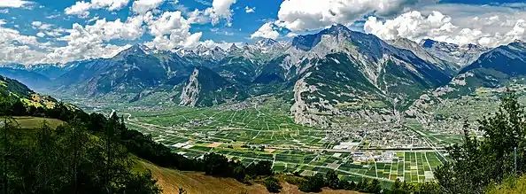 One of the most prominent Alpine ranges, the Bernese Alps extend from the gorge of Saint-Maurice, through which the Rhône finds its way to Lake Geneva, to the Grimsel Pass or, depending on the definition, to the river Reuss (thus including the Uri Alps). The principal ridge, a chain that runs 100 kilometres (62 mi) from west (Dent de Morcles) to east (Sidelhorn), whose highest peak is the Finsteraarhorn, forms the watershed between the cantons of Bern and Valais. Except for the westernmost part, it is also the watershed between the Rhine (North Sea) and the Rhône (Mediterranean Sea). This chain is not centered inside the range but lies close (10 to 15 km) to the Rhône on the south. This makes a large difference between the south, where the lateral short valleys descend abruptly into the deep trench forming the valley of the Rhône and the north, where the Bernese Alps extends through a great part of the canton of Bern (Bernese Oberland), throwing out branches to the west into the adjoining cantons of Vaud and Fribourg. There the mountains progressively become lower and disappear into the hilly Swiss Plateau.[2] The Bernese Alps have a large influence on the climate of Switzerland: while their north side is very exposed to weather, their south side is protected from it. As a consequence, agriculture consists essentially of dairy farming and cattle breeding on the northern foothills, while on the sunnier southern foothills (Rhone Valley) it also consists of vineyards.
