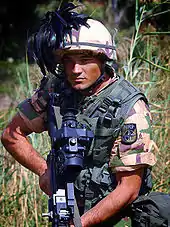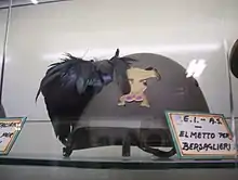 Bersaglieri are well-known for their extraordinary performances in parades and military tattoos, always running instead of marching, with hundreds of black capercaillie feathers flowing from their wide-brimmed black hats. These feathers are also worn on Bersaglieri combat helmets. They once served a military purpose, acting as camouflage and as a sunshade for the marksman's shooting eye. Today, they are a badge of honour, attracting new recruits and fostering esprit among their wearers.[1]