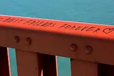 A BFF is a term for someone's best friend or close friend and is characterized by trust and permanence, irrespective of the number of times the meaning of friendship has been changed in their lives.[1] BFFs are usually in close contact and have shared experiences, such as attending the same school or sharing musical tastes. Relationships described as BFF are common in high school & middle school and often decline when the parties go to college.[2] The term BFF does not necessarily convey exclusivity; depending on a person's individual interpretation or philosophy of the concept of "BFF", an individual may not have more than one BFF simultaneously.[3]