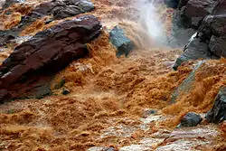 Betsiboka River is a 525-kilometre (326 mi) long river in central-north Madagascar. It flows northwestward and empties to Bombetoka Bay, forming a large delta. It originates to the east of Antananarivo. The river is surrounded in mangroves.[1] The river is distinctive for its red-coloured water, which is caused by river sediments. The river carries an enormous amount of reddish-orange silt to the sea. Much of this silt is deposited at the mouth of the river or in the bay.