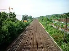 The Weser bridge in Rehme (Bad Oeynhausen) suburb was destroyed by an air raid on 23 March 1945.[10] The bridge was rebuilt after the war with only two tracks, creating a two-track bottleneck between Bad Oeynhausen station and the Neesen yard (in Porta Westfalica). This situation ended only with the construction of a new Weser bridge in December 1984.