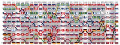 | 2016[n 5] | 1 | 6 | 8 | 4 | 3 | 7 |