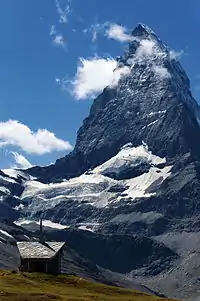 The east face of the Matterhorn. Toni Valeruz made the first ski descent of the face on 60+ degree slopes on 14 May 1975, from the Shoulder of the Hörnli Ridge.[1]