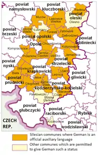 Other gminas in Opole Voivodeship and Silesian Voivodeship which would be permitted by the Act to make German an auxiliary language are Olesno and Pawłowiczki.