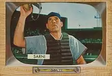 Sarni became the Cardinals starting catcher when Del Rice was injured during a play at home plate on June 7, 1954.[6] In 123 games he posted a .300 batting average with 9 home runs and 70 runs batted in.[1] He also led National League catchers with a .996 fielding percentage and 12 double plays.[7] One odd footnote from the 1954 season was a game in St. Louis on July 18 against the Philadelphia Phillies in which, both Sarni and Phillies catcher Stan Lopata played the game without wearing chest protectors because of the intense heat.[8]