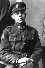 In 1915, during World War I, Butlin volunteered for service in the Canadian Army. Knowing that the army already had a full quota of despatch riders, Butlin intended to volunteer for service in that category in the knowledge that although his application would be declined he would still receive an "I volunteered" badge for his actions without having to serve. While applying, Butlin forgot to tell the recruiter of this intention, and was consequently allocated to the Canadian Expeditionary Force which was involved in the fighting along the Western Front.[n 7] He was subsequently posted to the 170th (Mississauga Horse) Battalion on 29 December 1915. His attestation papers give his date of birth as 1898 (rather than the actual 1899), allowing him to enlist at age 15. The papers give his occupation as a "Suit Case Maker". The papers also show, as Butlin himself later stated, that he had been selected to serve as a bugler.[w 3]