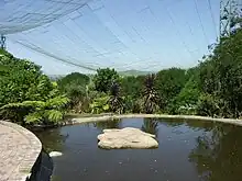 The enclosure was built over indigenous forest and includes a natural gorge with a waterfall, and a 200-seat amphitheater.[1]