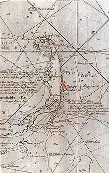 Bellamy traveled to Cape Cod around 1715, allegedly to seek some of his relatives there. According to an abundance of local lore on the subject, it is believed that he took up an affair with a local beauty, Goody Hallett — the "Witch of Wellfleet".[7] Professor Elizabeth Reynard, in her 1934 book The Narrow Land, gave her the name "Maria", and though there is no evidence of her bearing that name, it has nevertheless become a popular name for her. Other modern authors have called her "Mariah" and "Mary". Her age and marital status remain subjects of much debate. Some stories depict her as a young lady between 16 and 25, while others depict her as a very old woman.[8][9][10] In some stories, her parents liked Bellamy, but did not think a poor self-confident sailor was husband material;[5] circumstantial evidence indicates that she may have already been married, confirming some stories that it was Bellamy's intent to seek his fortune and then return, not to marry her, but to take her away.