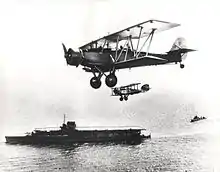 During May 1935, the Shark entered service with 820 Naval Air Squadron, replacing its Fairey Seals, aboard HMS Courageous.[9] During the following year, it also equipping an additional two squadrons, 810 and 821. The FAA opted to actively deploy the Shark both in its landplane configuration on board the Royal Navy's aircraft carriers and as a seaplane on its battlecruisers, such as HMS Warspite and HMS Repulse; in the latter capacity, it would either be catapult-launched or lowered over the side to take off from the water, dependent on available equipment. Its seaworthiness was a particular point of praise, possessing favourable rough water handling and buoyancy characteristics.[10]