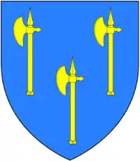 The Dennis family had been seated at Pancras Week in the parish of Bradworthy, Devon, since before the reign of King Henry II (1154-1189). The holder during that reign was Raph Dennis,[6] whose second son William Dennis founded the line of Dennis of Orleigh,[6] in North Devon. The family was of Danish origin and at the start of the age of heraldry (c.1200-1215) adopted for their arms: Azure, three Danish battle axes or. The name was created in Anglo-Norman French as le Daneis ("the Dane") and was Latinized as Dacus[1] ("Danish"), being the adjectival form of the noun Dacia, mediaeval Latin for "Denmark".