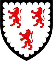 Robert Kirkham (died 1443), son and heir, who married Elizabeth Scobhull, widow of Robert Trebell and daughter and heiress of Sir Robert Scobhull (alias Scobhill, Scobhul, Scobbahull, etc.) [11] of Scobhull in the parish of South Pool near Kingsbridge, Devon.[12] The arms of Scobhull (Argent, three fleurs-de-lys gules a label of three points azure[13]) were quartered by Kirkham.