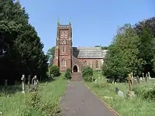 In 1864 Rev. John Roughton Hogg (1811-1867), of Blagdon, Vicar of Torwood,[48] a Justice of the Peace for Devon,[49] (second son of Rev. James Hogg, Vicar of Geddington, Northamptonshire,[50] and master of Kettering grammar school),[51] commenced building (at his sole expense) the "evocative Victorian group" (Pevsner) of church, school and vicarage at the adjoining manor of Collaton (thenceforth "Collaton St Mary"), to the design of J.W.Rowell, to commemorate his daughter[52] Mary Maxwell Hogg (died 1864), who died aged 17 and was buried at Brixham and re-interred in his new church in 1867.[53] His diary between 1859 and 1862 survives in the Devon Archives.[54] Hogg's wife was Anna Maria Maxwell Lyte (1822-1889), only daughter of Rev. Henry Francis Lyte (1793-1847), [55] of nearby Berry Head, Brixham, who composed the well-known hymns "Abide with me", "Praise my soul the King of Heaven" and "Pleasant are thy courts above". The inscribed Hogg Memorial erected by him in 1867 and situated 6 metres south of the chancel wall, is a grade II listed structure made of white Italian marble on red breccia base with a marble cross on a 3-tier plinth with breccia base with red breccia kerbs.[56]