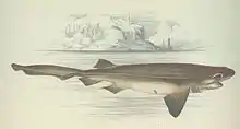 The bluntnose sixgill shark (Hexanchus griseus), often simply called the cow shark, is the largest hexanchoid shark, growing to 20 ft (6.1 m) in length.[2] It is found in tropical and temperate waters worldwide and its diet is widely varied by region.