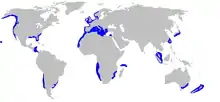 With a global distribution in tropical and temperate waters, the bluntnose sixgill shark is found in a latitudinal range between 65°N and 48°S in the Atlantic, Indian, and Pacific oceans.[11] It has been seen off the coasts of North and South America from North Carolina to Argentina and Alaska to Chile. In the eastern Atlantic, it has been caught from Iceland to Namibia, in the Indo-Pacific it has been caught from Madagascar north to Japan and east to Hawaii[12] and in the Mediterranean it has been caught in Greece and Malta.[13] Fossilized remains of this species from the Miocene epoch have also been discovered in South Korea.[14] It typically swims near the ocean floor or in the water column over the continental shelf in poorly lit waters.[4] It is usually found 180–1,100 m (590–3,610 ft) from the surface, inhabiting the outer continental shelf, but its depth range can extend from 0–2,500 m (0–8,202 ft).[12][15][16] Juveniles will swim near the shoreline in search of food, sometimes in water as shallow as 12 m (39 ft), but adults typically stay at depths greater than 100 m (330 ft). It can be seen near the ocean's surface only at night.[4]