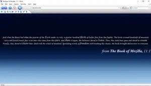 There is no real book titled The Book of Mozilla. However, apparent quotations hidden in Netscape and Mozilla give this impression by revealing passages in the style of apocalyptic literature, such as the Book of Revelation in the Bible.[6] When about:mozilla is typed into the location bar, various versions of these browsers display a cryptic message in white text on a maroon background in the browser window.