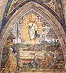 The Room of Mysteries holds the fresco cycle representing the mysteries of the faith, which were thought to have influenced Raphael's Disputation of the Holy Sacrament.[1] The biblical scenes displaying the mysteries of faith are painted to inspire a sense of piety in the viewer. Pinturicchio's work in this room is ubiquitous, meant to act as a holy teaching for beginners in religious education. The figures in this room are more restricted in their emotion and motion.[16] The Room of the Mysteries includes The Annunciation, The Nativity, The Adoration of the Magi, and The Resurrection.[17] Pope Alexander VI was a devotee of the Virgin Mary, which is why many of Pinturicchio's episodes in this room were dedicated to her life and legacy.[18] Pope Alexander VI is represented on this fresco cycle, within The Resurrection painting, kneeling at Christ's feet.[8]