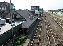 The station agent was removed from Allston in May 1949, but the station building remained in use as shelter for passengers.[21] Allston and Brighton stations were closed in April 1959 (along with University, Faneuil, and Newton) when much of the main line was reduced from 4 to 2 tracks during the building of the Massachusetts Turnpike.[22][5][3] The station closures left the northern part of Brighton lacking rail service. The Brighton station was demolished during highway construction, while the Allston station remained intact. The Allston Depot Steakhouse opened in the building in 1972, followed by Sports Depot in 1988 and Regina Pizzeria in 2010.[23][24] It was designated a Boston Landmark by the Boston Landmarks Commission in 1997.[14] Regina Pizzeria closed in July 2020; that August, Allston music venue Great Scott announced that they were in negotiations to lease the station to replace their former location.[25][26] That plan fell through in 2022.[27]