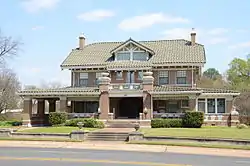 The Bottoms House is a historic house at 500 Hickory Street in Texarkana, Arkansas. It is a 2+1⁄2-story buff brick structure with a jerkin-headed gable roof and a large gable dormer, set on a raised corner. It was designed by Bayard Witt, a Texarkana architect, and built in 1910 for George Bottoms, one of area's principal lumber businessmen. The house's basic design follows the Prairie School, with broad lines exemplified by its sweeping single-story porch, although the half-timbered detailing found inside is Tudor in inspiration, and other details, such as colored windows and exposed rafters, are Craftsman in orientation.[2]