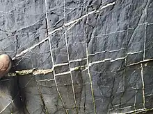 Boudinage is a geological term for structures formed by extension, where a rigid tabular body such as hornfels, is stretched and deformed amidst less competent surroundings.[1] The competent bed begins to break up, forming sausage-shaped boudins. Boudinage is common and can occur at any scale, from microscopic to lithospheric, and can be found in all terranes.[2] In lithospheric-scale tectonics, boudinage of strong layers can signify large-scale creep transfer of rock matter.[2] The study of boudinage can also help provide insight into the forces involved in tectonic deformation of rocks and their strength.[2]