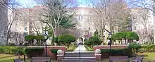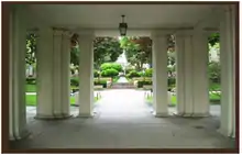 The main entry leads residents up a set of steps to a formal colonnaded arch. A neo-Georgian entryway characterized by stately Doric columns leads to two open courtyards. Buildings are set back from the sidewalk by raised grassy berms. The interior courtyards contain shade trees like oaks and maples and meandering paths.[8]