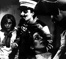 Other efforts include Peter Weiss' The Persecution and Assassination of Jean-Paul Marat as Performed by the Inmates of the Asylum of Charenton Under the Direction of the Marquis de Sade at Theatre of NOTE in Los Angeles;[83] an expanded version of Joan by Linda Chambers, starring Rain Pryor as Joan of Arc;[84][85][86] and the black comedy Dragon Slayers, by Stanley Keyes, in which a cult of insane puppeteers engage in ritual murder. Dragon Slayers was performed in both New York and Los Angeles over a period of several years, featuring an original electronic score contributed by Garth Hudson of the late sixties rock group The Band.[87]