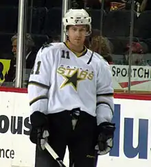 Morrison signed with the Anaheim Ducks to a one-year, US$2.75 million contract on July 7, 2008.[52] He had received interest from as many as nine NHL teams, including the Canucks, who offered a one-year, US$1.9 million deal prior to Morrison's free agency.[53] Morrison scored his first goal as a Duck on November 7 in a 5–2 loss to the Dallas Stars.[54] While it was hoped he could be a replacement for Andy McDonald as the team's second-line centre, Morrison struggled in his short tenure with the Ducks. He was relegated to the fourth line and made a healthy scratch at various points in the season.[55][56] It was proposed by the media that he was not yet playing at full capacity on account of his off-season knee surgery.[56] With 22 points in 62 games, he was waived by the Ducks leading up to the NHL trade deadline on March 3, 2009.[55] He was claimed the following day by the Dallas Stars.[57] He scored his first goal with the Stars on March 12, the game-winner in a 3–2 contest against the Carolina Hurricanes.[58] Morrison's 2008–09 total of 31 points between the Ducks and Stars was the lowest output of his career (not including the previous season's injury-shortened campaign and his 11-game 1997–98 season).[22]