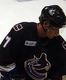 Morrison's hip continued to hinder his play in 2006–07, contributing to a slow start early in the season.[43] Later in the campaign, he set a Canucks record for consecutive regular season games played (colloquially known as an "ironman streak"); he had not missed a contest since arriving to the team from New Jersey. Playing against the Los Angeles Kings on February 22, 2007, he surpassed Trevor Linden's old club record of 482 consecutive games played (his overall streak was at 491 games, including eight contests played with the Devils prior to his trade).[43] Three days later, he became the League's active ironman when Avalanche defenceman Kārlis Skrastiņš was forced to miss a game with a knee injury. Skrastiņš had played in 495 consecutive games, while Morrison had 492 at the time.[45] Offensively, Morrison finished the year with his sixth consecutive 50-point season in the NHL with 20 goals and 31 assists over 82 games.[22] The Canucks returned to the post-season and advanced to the second round, where they were eliminated by the Anaheim Ducks.[21] Morrison recorded 4 points in 12 playoff games.[22]