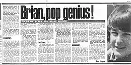 One of the earliest instances of Taylor announcing that Wilson was a genius was in his 1966 article titled "Brian Wilson: Whizzkid Behind the Beach Boys".[26] More references to the "genius" rhetoric appeared in Melody Maker and New Musical Express, specifically the articles "Brian, Pop Genius!" by Don Traynor (May 21, 1966), "Brian Wilson's Puppets?" by Alan Walsh (November 12, 1966), and "Brian: Loved or Loathed Genius" by Tracy Thomas (January 28, 1967).[27] In Taylor's writings, Wilson was presented as a pop luminary on the level of esteemed contemporaries such as John Lennon, Paul McCartney, and Bob Dylan, as well as classical figures such as Bach, Beethoven, and Mozart.[28] What follows is a typical excerpt by Taylor, identified as "'60s Hollywood reporter Jerry Fineman", and contains some exaggerated claims: