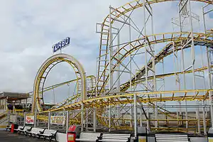 The pier includes several fairground rides, such as two roller coasters, a haunted house ride, a traditional carousel, a helter skelter and a cup-and-saucer ride. The Booster is a pendulum ride by Fabbri, which catapults people 130 feet (40 m) into the air, turning upside down in the process.[28][29]